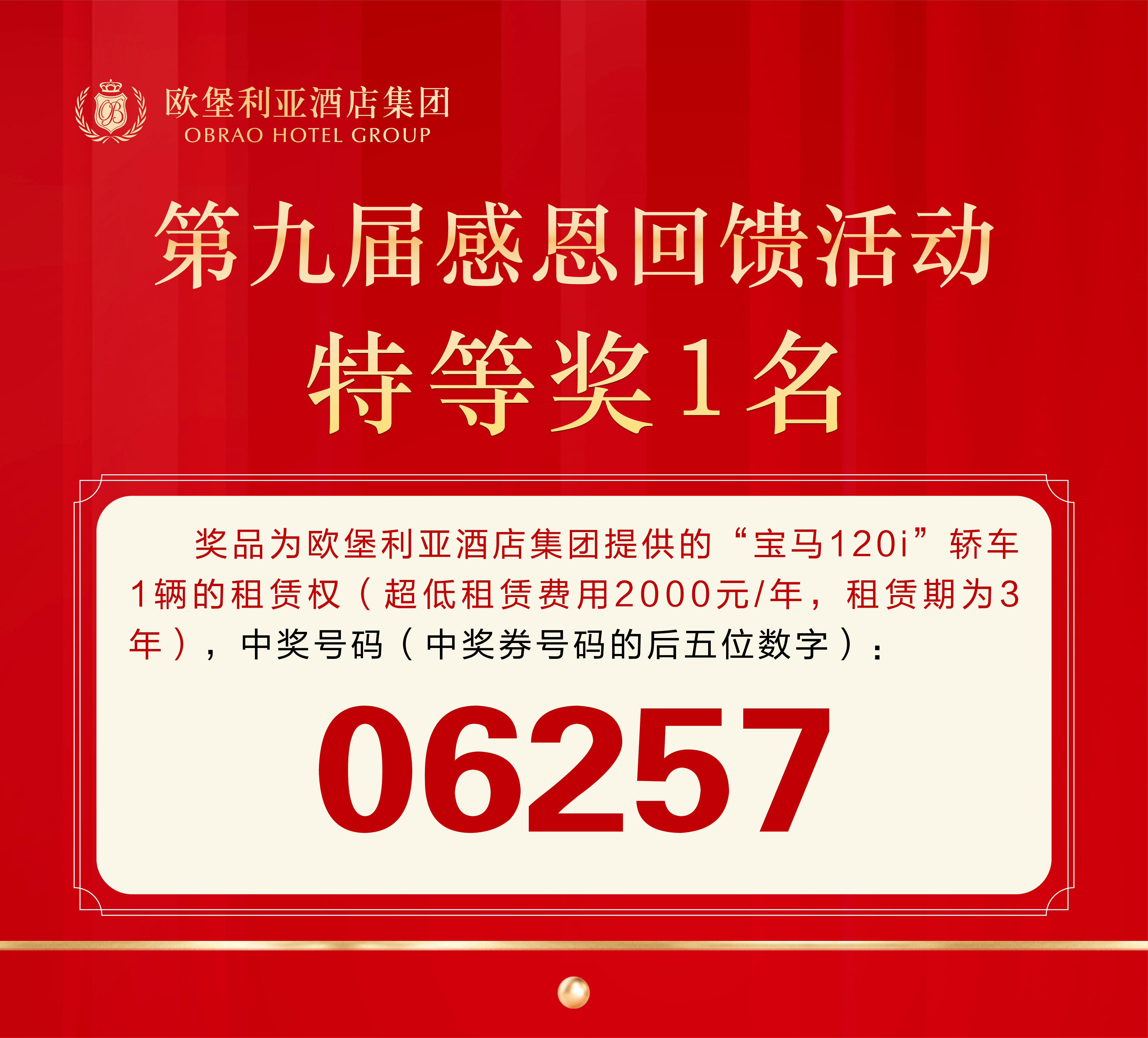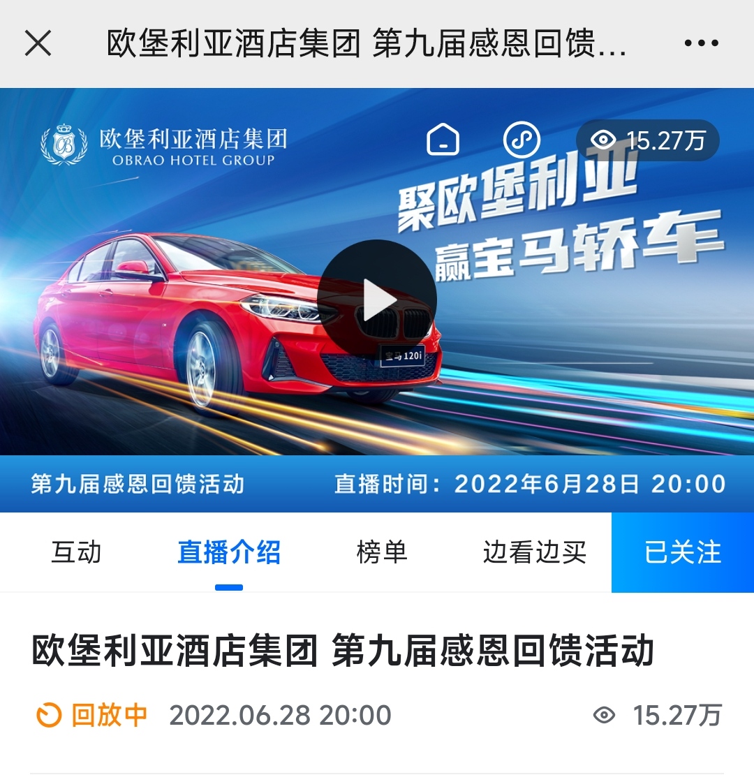 十一年風雨歷程,十一年品質堅守;十一年成長壯大,十一年相伴前行。為感恩社會各界人士及廣大賓客朋友長期以來的關注與支持、信任與相隨,2022年6月28日20時,歐堡利亞酒店集團以線上直播的方式揭開了“第九屆感恩回饋活動”的帷幕,社會各界人士及歐堡利亞酒店賓客朋友15萬多人通過“歐堡利亞酒店集團微信公眾平臺”和“智慧濱海APP”,激情觀看了抽獎直播和在線見證了本屆活動五個獎項中獎號碼的現場產生,享受或分享中得“寶馬120i”轎車1輛的3年低租使用權、歐堡利亞一卡通15萬元的喜悅和以20元秒殺搶到歐堡利亞一卡通現金券6萬元、超低價搶購歐堡利亞酒店集團旗下各酒店的相關產品。