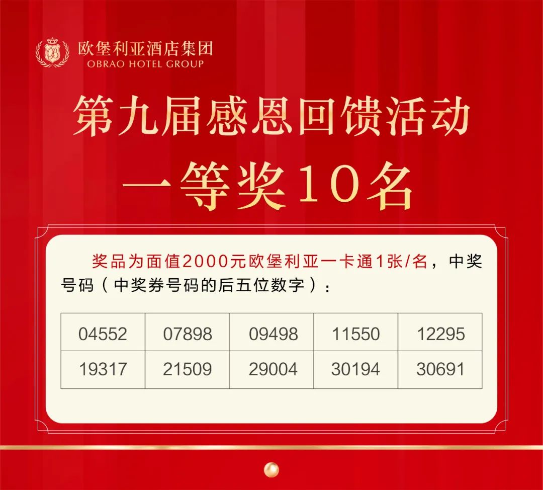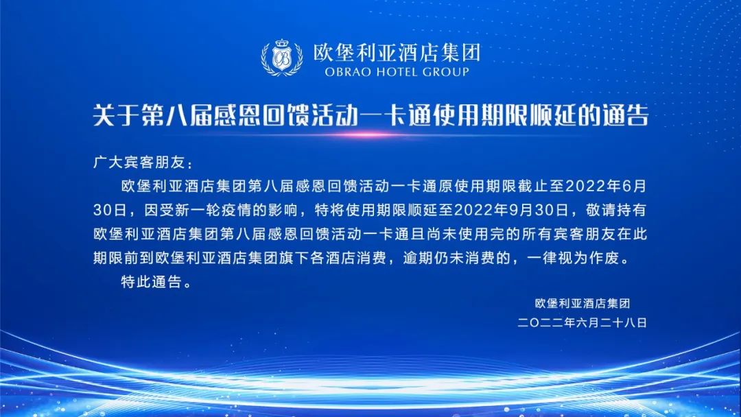 ▲ 關(guān)于第八屆感恩回饋活動(dòng)一卡通使用期限順延的通告在歐堡利亞酒店集團(tuán)第九屆感恩回饋活動(dòng)接近尾聲時(shí),“歐堡利亞酒店集團(tuán)第十屆感恩回饋活動(dòng)”正式啟動(dòng),在2022年6月28日至2022年12月27日期間,凡在歐堡利亞酒店集團(tuán)旗下的所有酒店一次消費(fèi)滿(mǎn)1000元或一次預(yù)付消費(fèi)滿(mǎn)1000元的客戶(hù),均可獲贈(zèng)歐堡利亞酒店集團(tuán)第十屆感恩回饋活動(dòng)的抽獎(jiǎng)券1張,讓更多的歐堡利亞酒店新老賓客朋友在切身領(lǐng)略到舒適的入住體驗(yàn)與美味的用餐感受后享受不虞之驚喜。歷時(shí)50分鐘,歐堡利亞酒店集團(tuán)第九屆感恩回饋活動(dòng)在一片驚喜、歡欣、快樂(lè)、溫情的氛圍中圓滿(mǎn)收官,這是歐堡利亞酒店集團(tuán)縱深推進(jìn)市場(chǎng)營(yíng)銷(xiāo)工作的重要舉措,贏(yíng)得了廣大賓客朋友的熱烈回應(yīng)。時(shí)光流轉(zhuǎn),歲月更迭,不變的是歐堡利亞酒店集團(tuán)與廣大賓客朋友分享耕耘成果、共贏(yíng)未來(lái)的初心。未來(lái)的日子里,歐堡利亞酒店集團(tuán)賡續(xù)將感恩作為酒店品牌文化建設(shè)的重要組成部分,非常珍惜與廣大賓客朋友建立起來(lái)的長(zhǎng)期友好的合作關(guān)系,矢志不渝地追求更好的服務(wù)品質(zhì),以實(shí)際行動(dòng)詮釋一個(gè)企業(yè)應(yīng)有的社會(huì)情懷和承擔(dān)的社會(huì)責(zé)任,發(fā)出社會(huì)的好聲音、傳遞行業(yè)的正能量,讓“相知多年,值得信任”的好口碑傳遍大江南北!