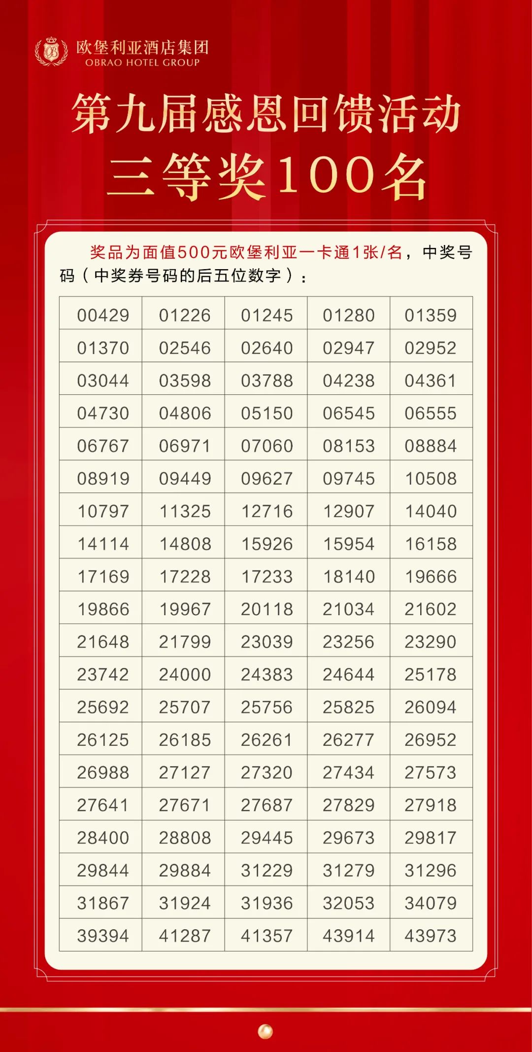 2022年6月29日,歐堡利亞酒店集團(tuán)第九屆感恩回饋活動(dòng)五個(gè)獎(jiǎng)項(xiàng)的311個(gè)中獎(jiǎng)號(hào)碼均已刊登在《濱海日?qǐng)?bào)》上。