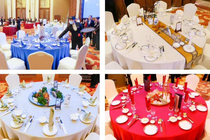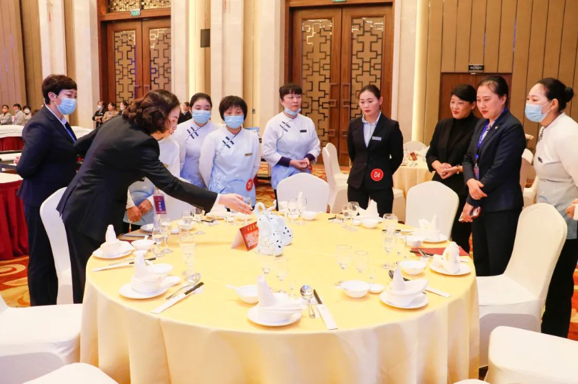 餐廳服務參賽選手面帶微笑、步履輕盈,一舉一動間迸發(fā)出規(guī)范、標準、優(yōu)雅、自信,輕輕一拋、準確無誤地將臺布十字居中地鋪在餐桌上,又從主人位開始拉椅定位,麻利地將碗、碟、盤、勺、筷架、筷子、三套杯等一整套光潔的餐具依序擺開,整個桌面呈現(xiàn)出層次分明、中心對稱的擺臺造型;擺放好餐具后,參賽選手旋即拿起了一塊平淡無奇的餐巾,竟能折出帆船、四葉草、一帆風順等多種花型,頓時使擺放整齊美觀的餐具增添了藝術美感。