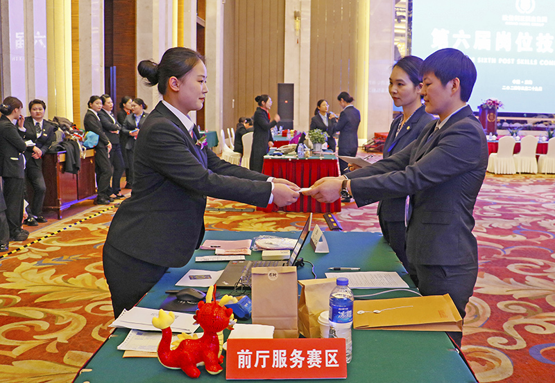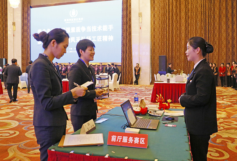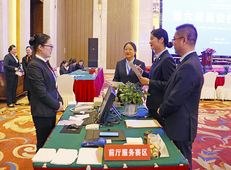 前廳服務參賽選手通過12分鐘的情景模擬,自然嫻熟地完成了接受預訂、辦理入住、結賬退房、抽題答題的考核環節,流利清晰的語言表達、規范標準的操作流程、優質高效的接待水平、靈活敏捷的應變能力、盡善盡美的對客服務,讓大賽評委和觀摩人員領略到前廳部被堪稱為整個酒店神經中樞的關鍵所在。
