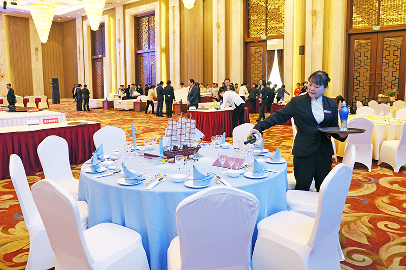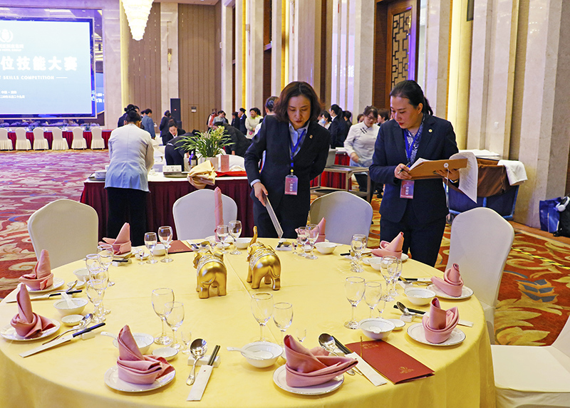 餐廳服務參賽選手面帶微笑、步履輕盈、全神貫注、有條不紊,一舉一動間迸發出規范、標準、優雅、自信,輕輕一拋、準確無誤地將臺布十字居中地鋪在餐桌上,又從主人位開始拉椅定位,麻利地將碗、碟、盤、勺、筷架、筷子、三套杯等一整套光潔的餐具依序擺開,整個桌面呈現出層次分明、中心對稱的擺臺造型;擺放好餐具后,參賽選手旋即拿起了一塊平淡無奇的餐巾,竟能折出多種花型,頓時使擺放整齊美觀的餐具增添了藝術美感。