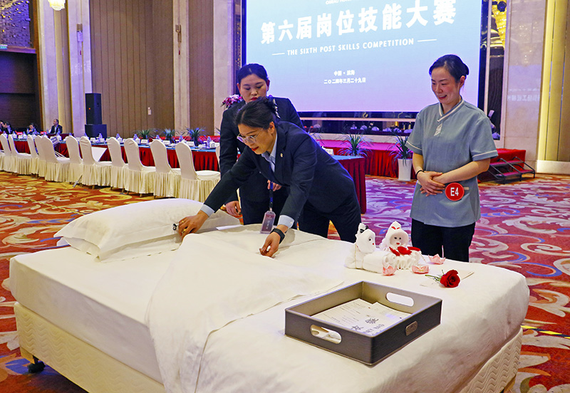 春寒料峭的三月轉眼就要結束,人間最美不過的四月垂將而至。為全面實施人才興企、提質增效的發展戰略,充分發揮崗位技能大賽在知識型、技能型、創新型的高素質員工隊伍建設進程中的引領示范作用,切實為歐堡利亞酒店事業高質量、跨越式發展提供強有力的技能支撐和人才保障,2024年3月29日,“歐堡利亞酒店集團第六屆崗位技能大賽”開幕式在歐堡利亞大酒店隆重舉行,歐堡利亞酒店集團總經理鄧棟、副總經理胡也華、戴婷婷、總經理助理李利、孫青春、戴翔,各單位及相關部門主要負責同志、各比賽項目評委及參賽選手、觀摩人員共計328人蒞臨了本次大賽現場,134名參賽選手現場秀絕活、激烈角逐8個比賽項目的51個獎項,12家參賽單位爭奪“優秀組織獎”、“最佳組織獎”的4個獎項。9時38分,歐堡利亞酒店集團總經理鄧棟在大賽開幕式上發表了熱情洋溢的致辭。鄧總指出,國以才立、業以才興,企業之間的競爭很大程度上就是人才的競爭。隨著社會的不斷發展和快速進步,具有較強動手能力的技能人才直接關乎到每一家酒店的產品質量、工作效率和經濟效益。歐堡利亞酒店集團始終高度重視技能人才的培養,技能大賽就是培養和發現技能人才的有效途徑之一,也是廣大員工切磋技藝、交流學習、取長補短、彰顯才能的一個重要平臺,是對參賽選手日常訓練的一次檢閱,更是歐堡利亞酒店人奮發向上、拼搏進取、敢為人先、勇爭一流的精神風貌的一種展示。為積極準備此次大賽,各參賽單位廣泛發動、認真組織,堅持培訓,表現出了極大的參與熱情;廣大參賽選手充分利用一切可以利用的時間,學標準,重效果,以賽促練,體現出了強烈的爭先意識。為真正將本屆崗位技能大賽辦成富有成效的一次賽事,鄧總著重強調了四點要求:一、希望技能大賽作為一項綜合性、系統性、長期性、基礎性的工作堅持下去,充分發揮大賽的引領作用,將技能提升與經營管理有機結合起來;二、希望各位參賽選手要嚴格遵循比賽規則,以飽滿的熱情、昂揚的斗志、良好的競技風貌,充分展示職業技能,賽出能力、賽出水平、賽出風格;三、希望各位大賽評委要認真地履行職責,嚴格按照比賽項目的評分標準,實事求是、客觀公正地為參賽選手評分,確保比賽公平、公正、公開;四、希望全體工作人員要忠于職守、熱情服務、周密安排,切實為參賽選手能取得理想的成績,營造緊張活潑、嚴格溫馨、萬無一失的競賽氛圍。第六屆崗位技能大賽設有客房服務(分為A、B兩組)、餐廳服務(分為A、B兩組)、前廳服務(分為A、B兩組)、熱菜制作、冷菜制作、精細刀工、保安實操、工程維修共計8個比賽項目,經過參賽單位學習標準、組織培訓、強化練習、層層選拔、提前預賽,參賽選手充分利用一切可以利用的業余時間,盡管日常工作后有些許勞累,卻依然無怨無悔地苦練崗位技能、用心奮力備賽。在主持人宣布第六屆崗位技能大賽開始后,身穿職業裝、佩戴評委證的大賽評委偕同身著工作裝、別著參賽牌的參賽選手,精神抖擻、笑容滿面地邁著鏗鏘有力、整齊劃一的步伐走向各比賽區。