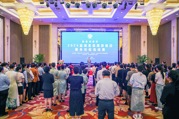 專業技能促服務提升,實景操作競賽場風流。為大力弘揚新時代工匠精神,全面加強星級旅游飯店人才隊伍建設,不斷擴大星級旅游飯店廣大員工服務技能的示范效應,切實提升星級旅游飯店的服務品質,賡續打造鹽城市優質旅游服務形象,2024年7月2日,由鹽城市文化廣電和旅游局主辦的2024年鹽城星級旅游飯店服務選拔賽在歐堡利亞大酒店歐堡廳拉開了帷幕,江蘇省文旅廳二級調研員黃樺、濱海縣委常委兼縣政府副縣長仇飛、鹽城市文廣旅局副局長侯德志及市場管理處處長于將、濱海縣文廣旅局局長張海峰、歐堡利亞酒店集團總經理/歐堡利亞大酒店董事長鄧棟、濱海縣文廣旅局副局長李臻球、市縣文廣旅局相關處(科)室工作人員、四個比賽項目的8位評委、來自全市各縣(市、區)代表隊領隊、19家星級旅游飯店的74名參賽選手及觀摩人員共計180多人蒞臨了選拔賽現場,歐堡利亞大酒店、歐堡利亞北辰酒店分別有7名、6名選手參加了此次選拔賽。