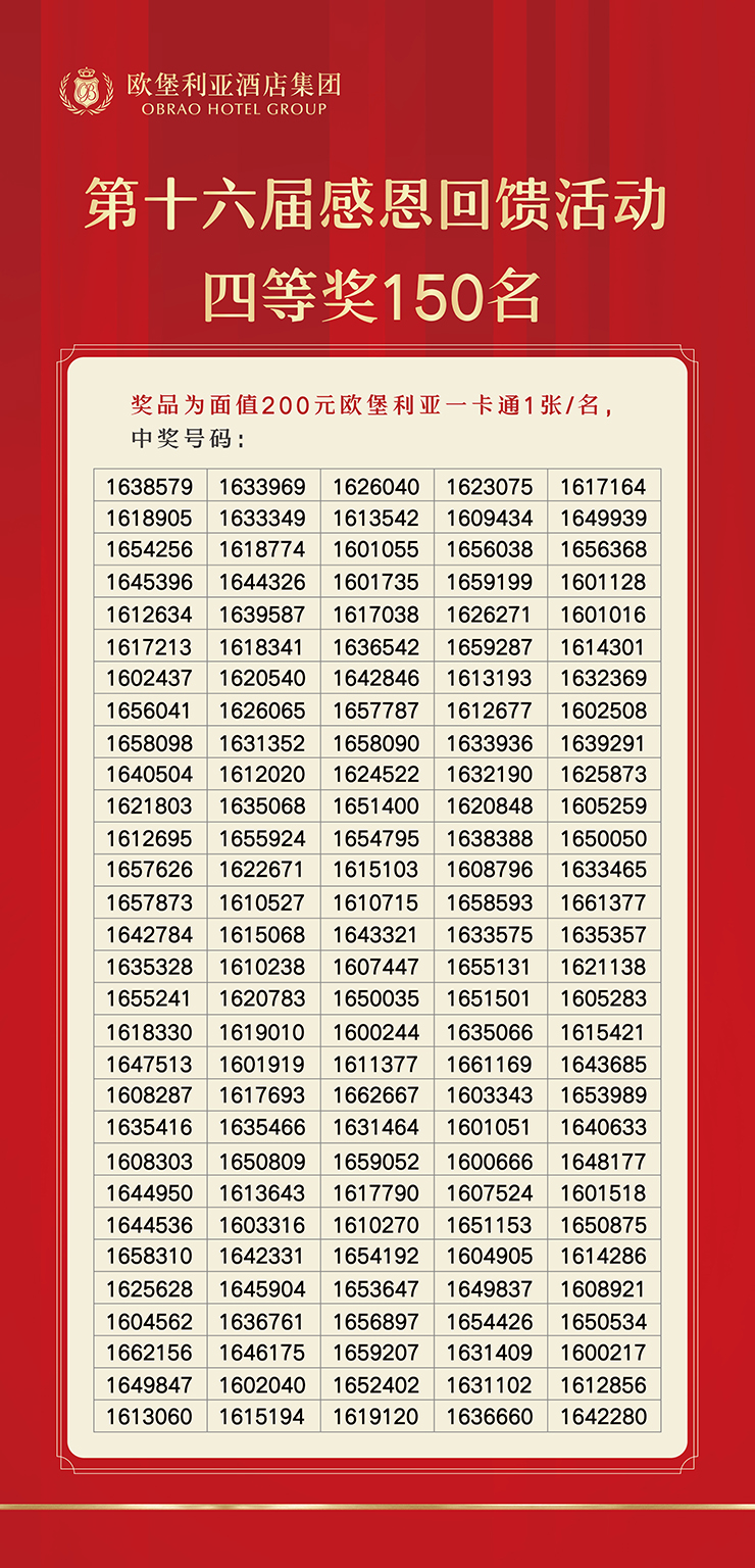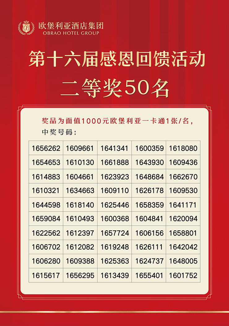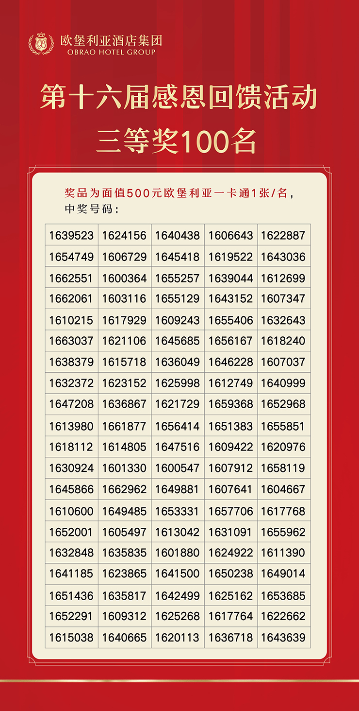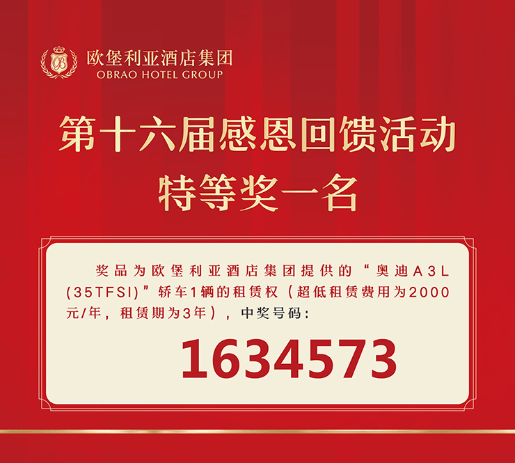 歐堡利亞酒店集團第十六屆感恩回饋活動接近尾聲時,“歐堡利亞酒店集團第十七屆感恩回饋活動”正式啟動,2025年12月28日至2026年6月27日期間,凡是在歐堡利亞酒店集團旗下各酒店一次消費滿1000元或一次預付消費滿1000元的賓客,均可獲贈“歐堡利亞酒店集團第十七屆感恩回饋活動”抽獎券1張,