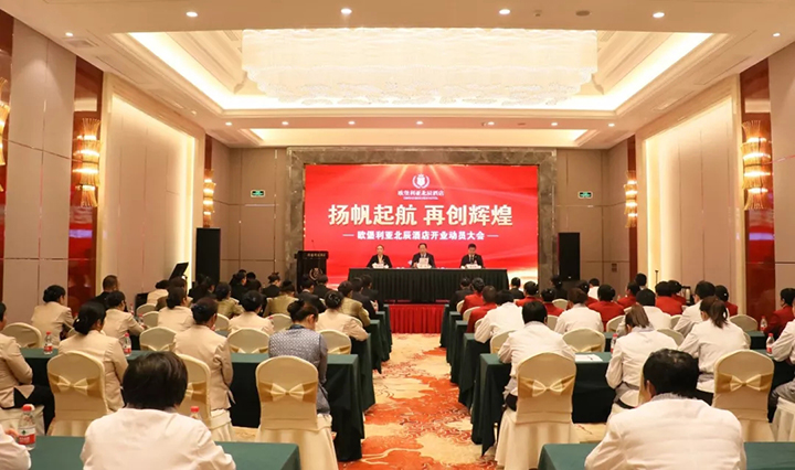 下午兩點鐘,歐堡利亞北辰酒店開業前動員大會在激越、雄壯的音樂中揭開了帷幕,歐堡利亞酒店集團總經理鄧棟作了題為《逐夢前行在路上 奮力再鑄新輝煌》的動員講話。