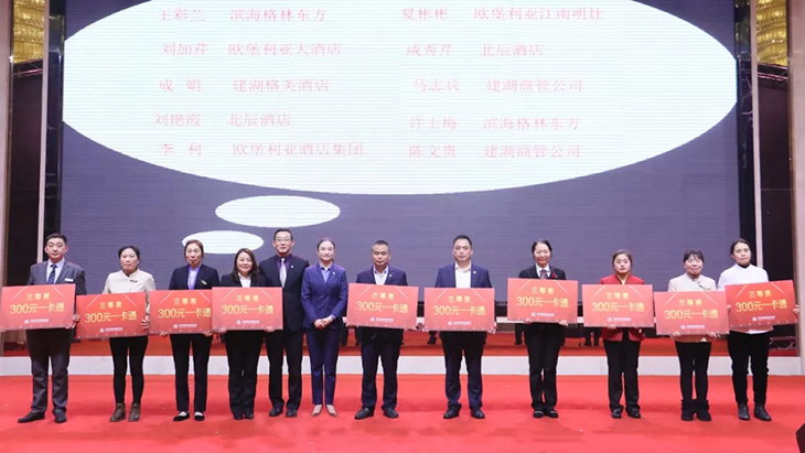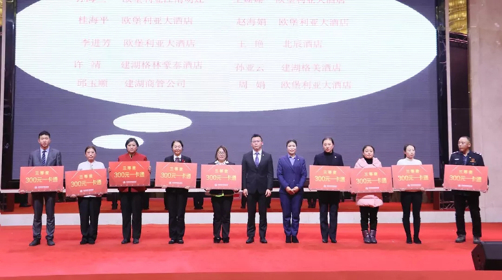建湖格林豪泰酒店店長助理周蘭婷為10名三等獎(jiǎng)中獎(jiǎng)?wù)哳C獎(jiǎng)