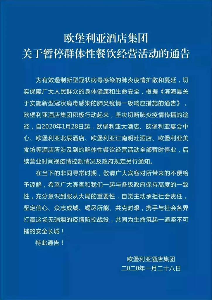 要求堅決切斷肺炎疫情的傳播途徑,自2020年1月28日起,大酒店、宴會中心、北辰酒店、江南明灶、美食坊等酒店所涉及到群體性的餐飲經驗活動全部暫時停業,恢復營業時間視疫情防控情況及政府規定再另行通知。