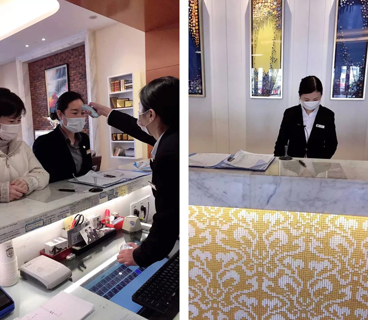 要求密切關注來自湖北、湖南等重疫區的賓客,如果發現立即報告,采取統一集中安置;備齊感應體溫計、一次性口罩,及時為賓客提供需求服務,并在每天早晚為所有入住酒店賓客各測一次體溫,發現異常情況立即報告。