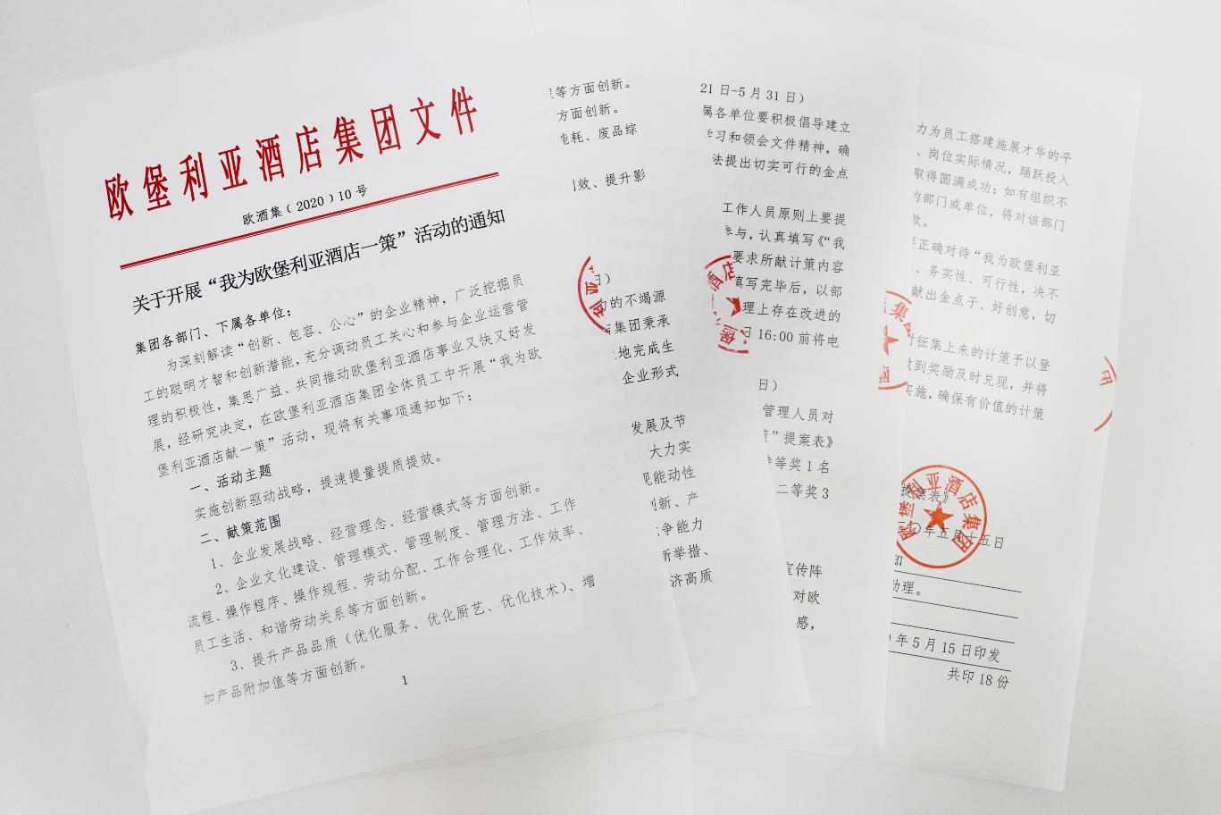 為深刻解讀“創新、包容、公心”的企業精神,不斷激發員工的企業主人翁精神和工作熱情,廣泛挖掘員工的聰明才智和創新潛能,充分調動員工關心和參與企業運營管理的積極性,2020年5月15日,歐堡利亞酒店集團開展了以“實施創新驅動戰略,提速提量提質提效”為主題的“我為歐堡利亞酒店獻一策”活動,整個活動分為宣傳發動、組織執行、實施驗證、評審激勵四個階段,酒店集團各部門、下屬各單位認真組織廣大員工踴躍參與此次活動,共同謀求歐堡利亞酒店事業在疫情防控常態化下的發展之路。