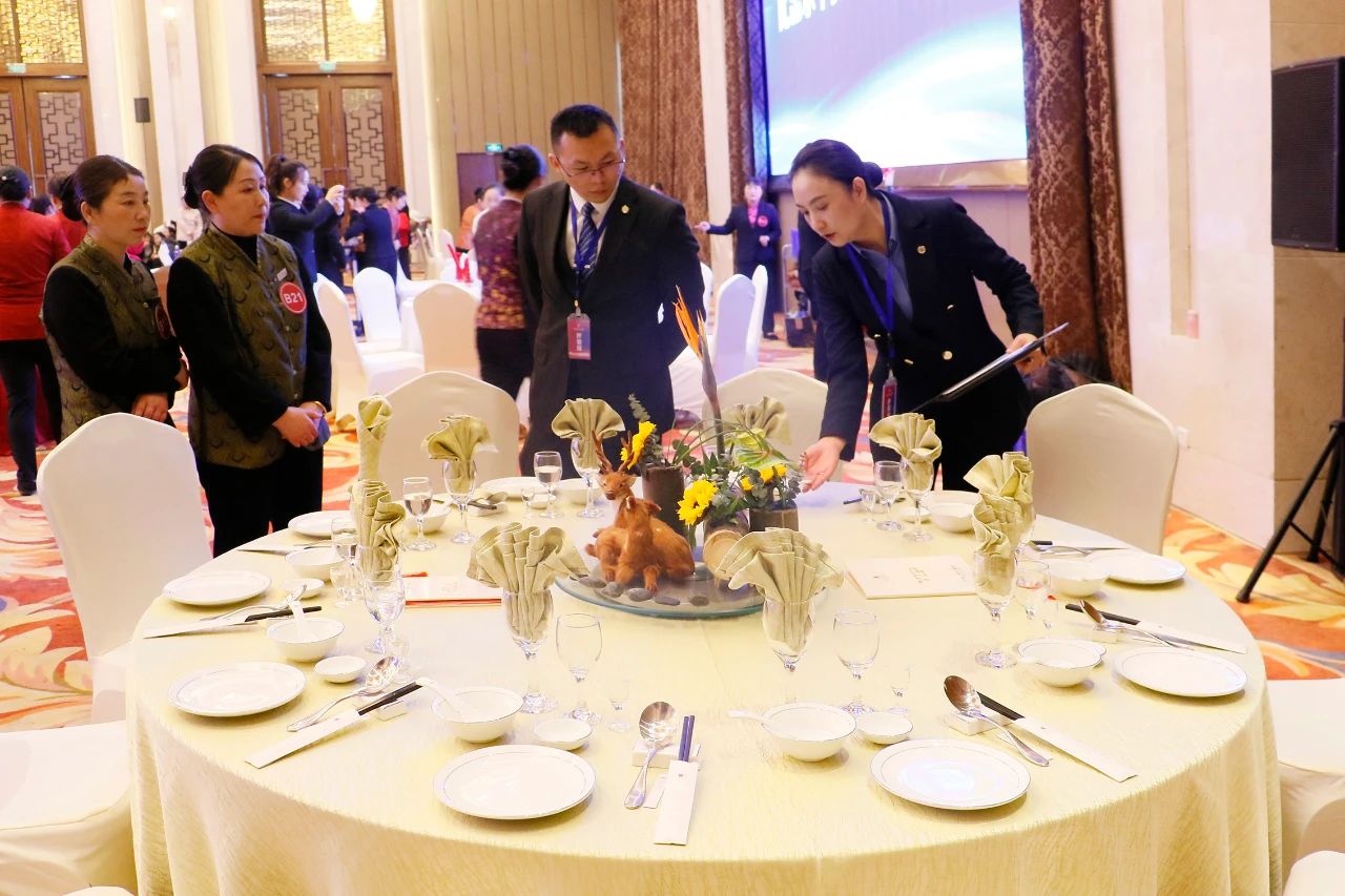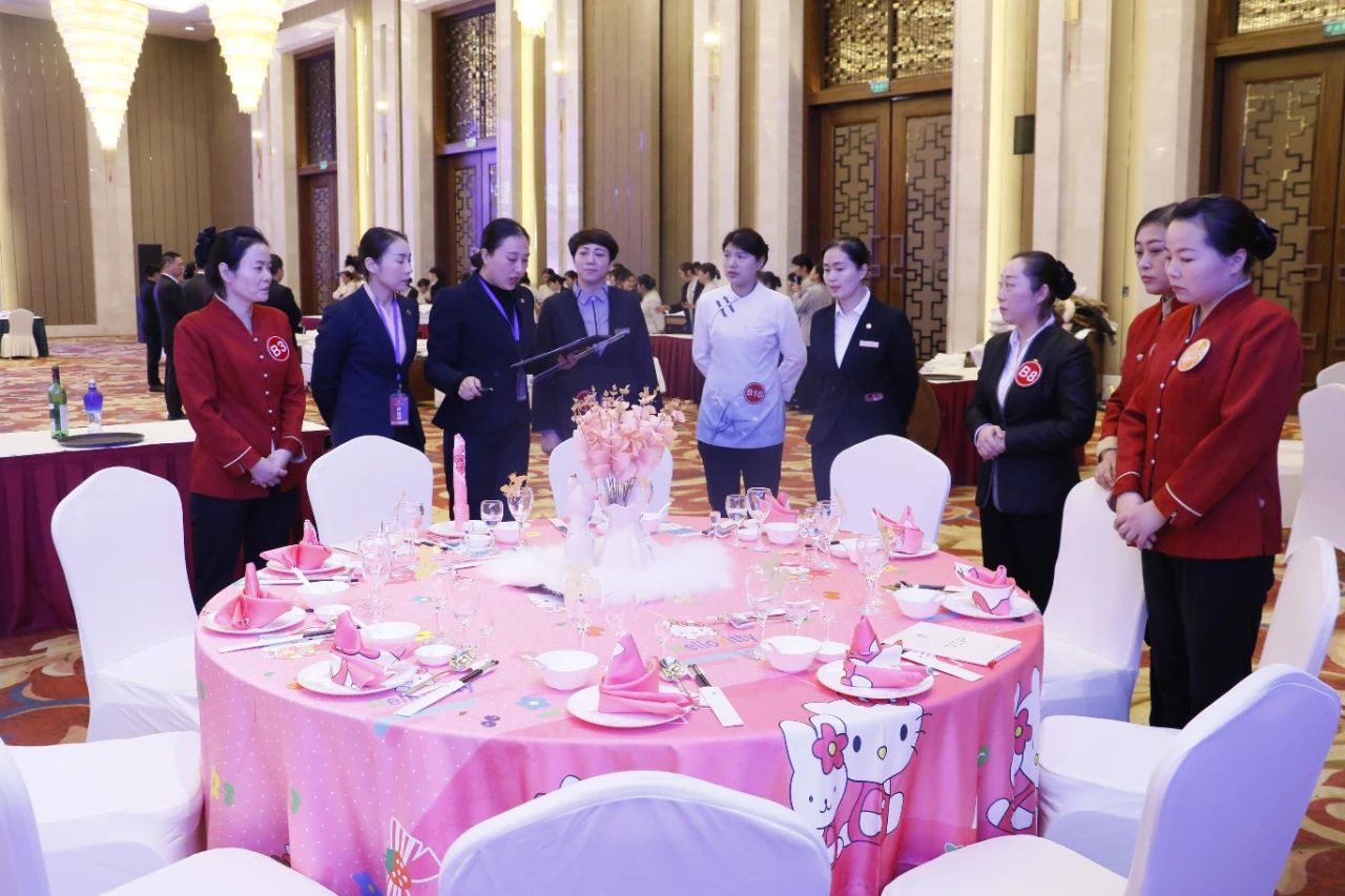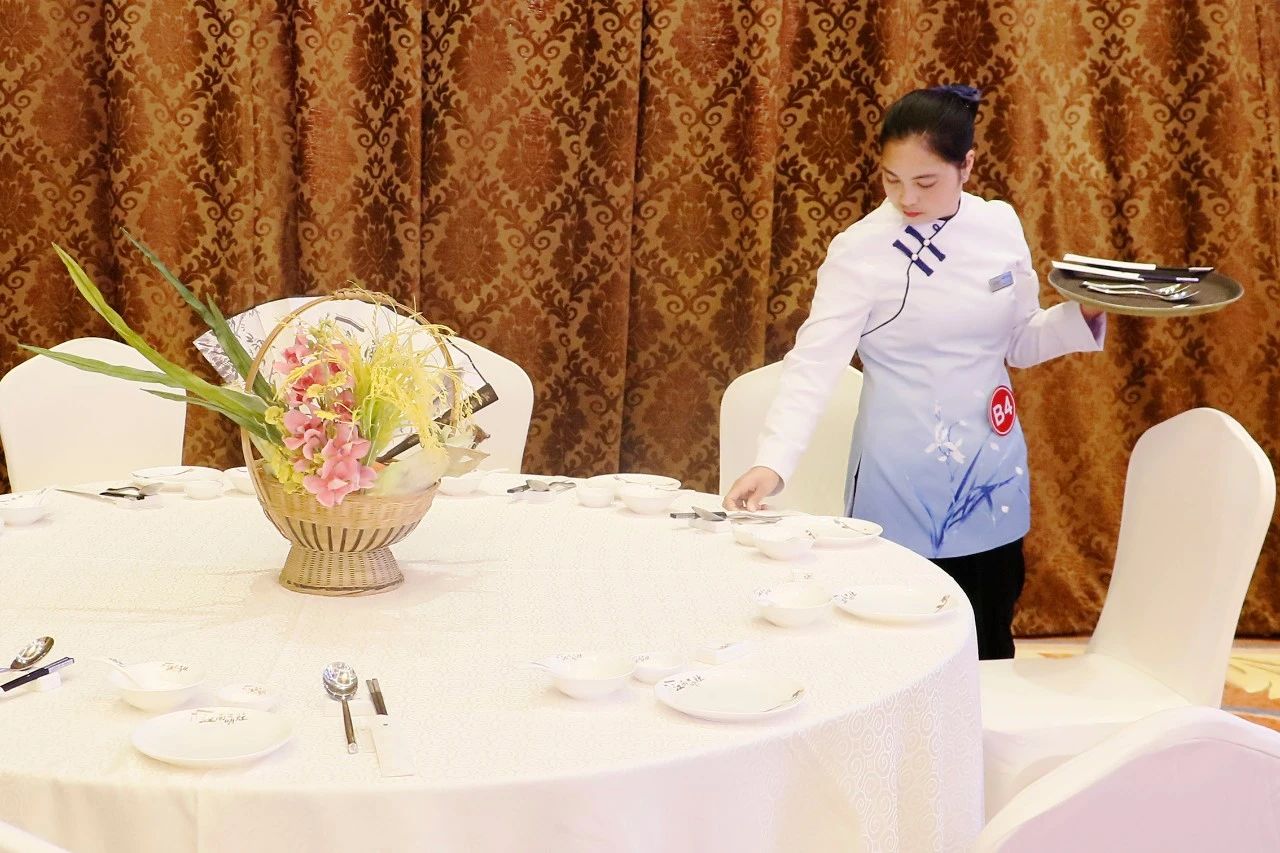 餐廳服務的參賽選手面帶微笑、步履輕盈,輕輕一拋、準確無誤地將臺布鋪在餐桌上,又從主人位開始拉椅定位,麻利地將碗、碟、盤、勺、筷架、筷子、三套杯等一整套光潔的餐具依序擺開,一塊平淡無奇的餐巾竟能被折出花開富貴、荷塘月色、喜結良緣等多種花,原本空無一物的圓餐桌經過參賽選手的創意裝飾頓時充滿了藝術美感,一舉一動間迸發出規范、標準、優雅、自信,這便是對餐廳服務技能最好的詮釋。