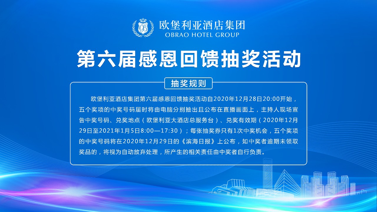 在第六屆感恩回饋活動接近尾聲時,“歐堡利亞酒店集團第七屆感恩回饋活動”正式啟動,凡在2020年12月28日至2021年6月27日期間,在歐堡利亞酒店集團旗下的所有酒店一次消費滿1000元或一次預付消費滿1000元的客戶,均可獲贈第七屆感恩活動抽獎券1張,讓更多的歐堡利亞酒店新老賓客朋友能享受消費之外的更大驚喜。