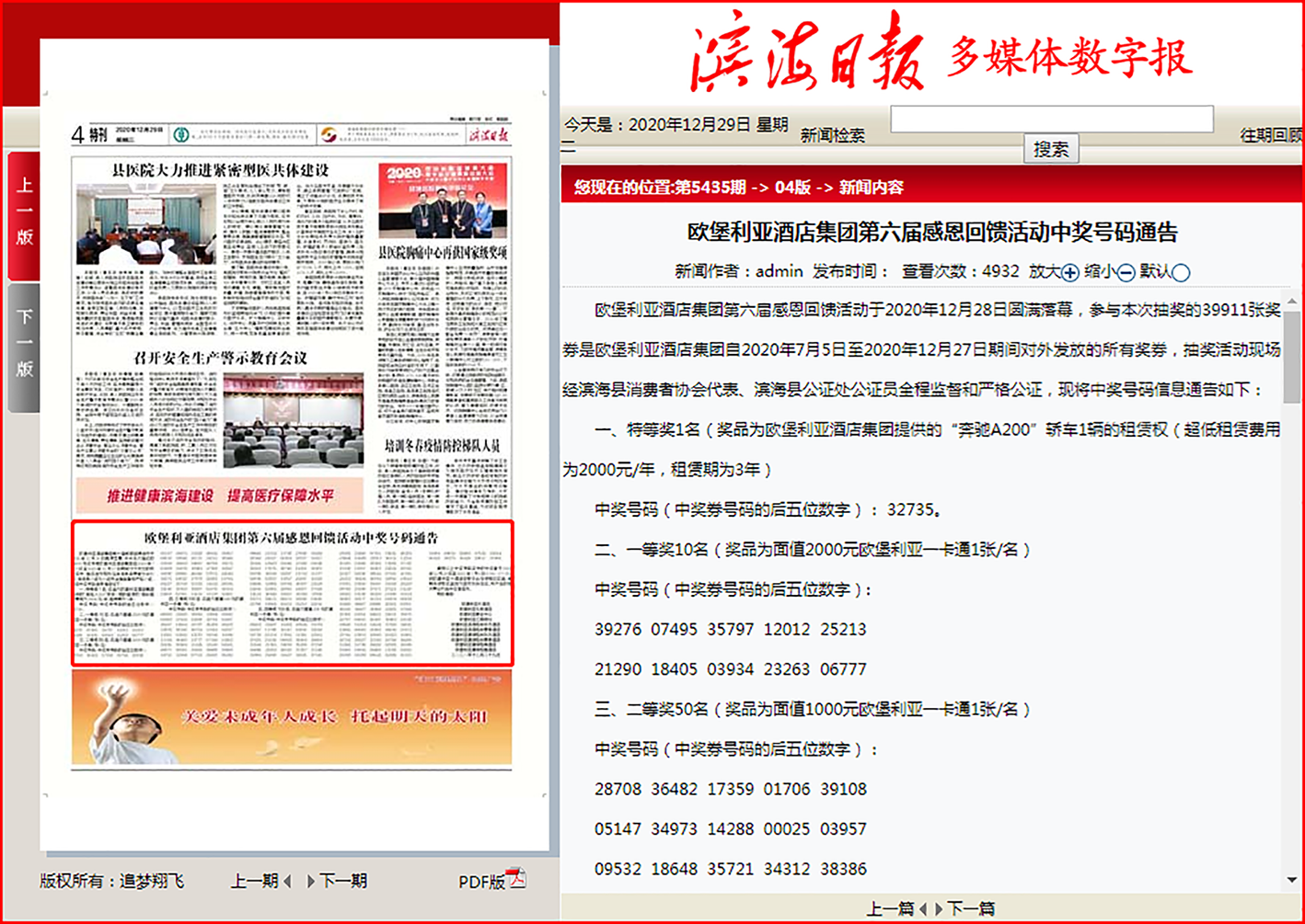 2020年12月28日20:00,社會各界人士及歐堡利亞酒店賓客朋友通過“歐堡利亞酒店集團微信公眾平臺”和“智慧濱海APP”,激情觀看“歐堡利亞酒店集團第六屆感恩回饋活動”的抽獎直播,近10萬人在線見證了本屆活動五個獎項中獎號碼的現場產生,親身體驗中得“奔馳A200”轎車1輛的租賃權、歐堡利亞一卡通15萬元的喜悅和秒殺搶到歐堡利亞一卡通現金券5萬元、現金紅包雨的刺激。