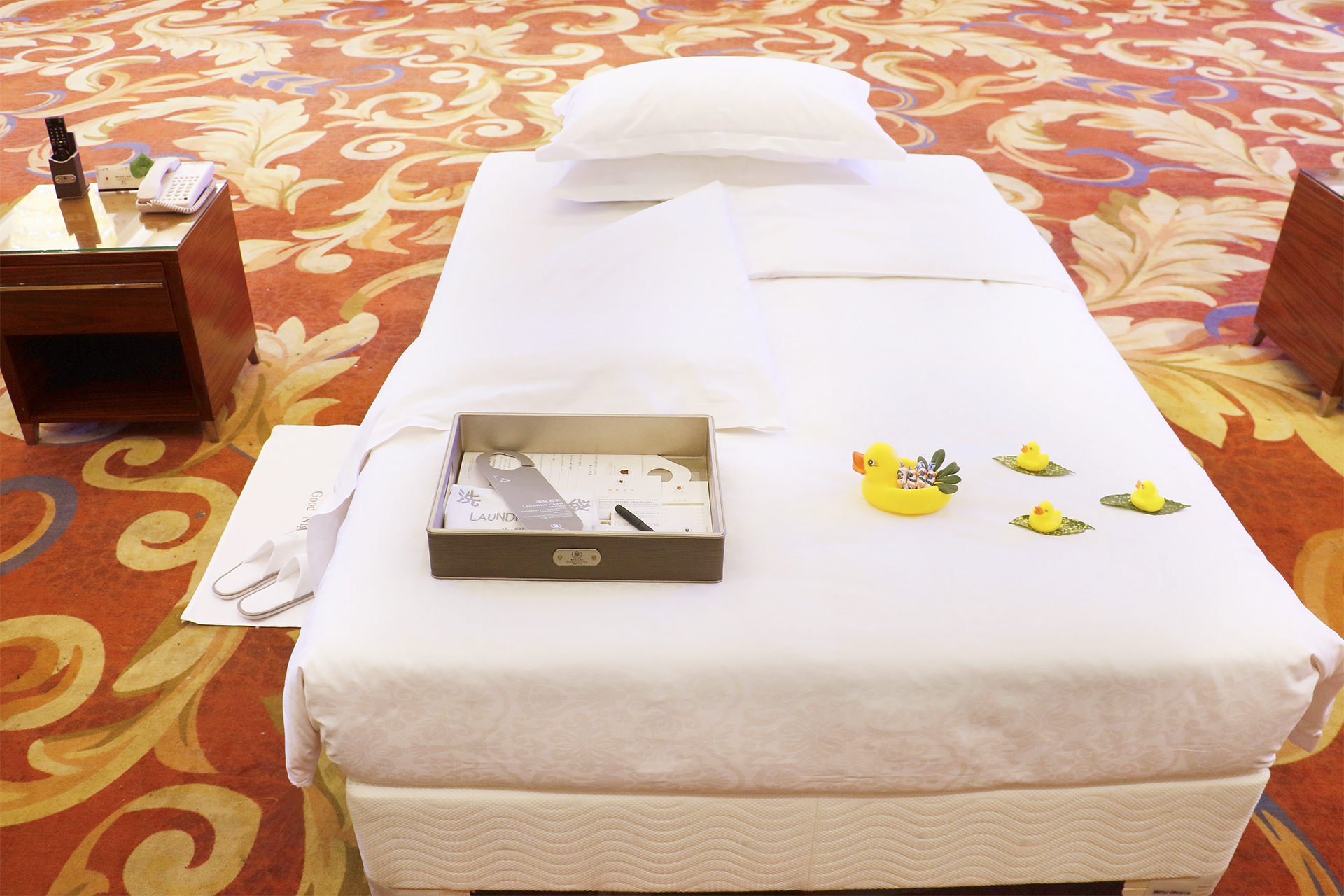 客房服務(wù)的參賽選手雙手抓住床單的兩角,床單向床頭飛出,隨即往下一按,一手平伸一撫,一手輕抬床墊,撫床單的手再做成手刀往床底下一砍,床單的一角就坦蕩如砥地壓在床墊下,有條不紊、一氣呵成的動(dòng)作頻繁劃出了一道道優(yōu)美的弧線,床腳呈現(xiàn)出一個(gè)標(biāo)準(zhǔn)的90度,四周緊密無褶皺,一張舒適、整潔、美觀的床就在3分鐘內(nèi)鋪就完畢;創(chuàng)意新穎、實(shí)用性強(qiáng)、藝術(shù)感好的一件件夜床作品凸顯了客房服務(wù)參賽選手對(duì)賓客的感動(dòng)式服務(wù)、個(gè)性化關(guān)懷,為大賽評(píng)委和觀摩人員呈現(xiàn)了一場(chǎng)美輪美奐的視覺盛宴。