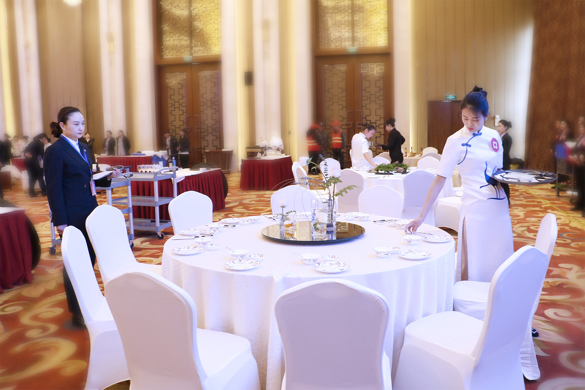 第四屆崗位技能大賽設(shè)有客房服務(wù)(分為A、B兩組)、餐廳服務(wù)(分為A、B兩組)、前廳服務(wù)(分為A、B兩組)、熱菜制作、冷菜制作、精細(xì)刀工、保安實(shí)操、工程維修、財(cái)務(wù)技能共計(jì)9個(gè)比賽項(xiàng)目,經(jīng)過參賽部門、參賽單位的學(xué)習(xí)標(biāo)準(zhǔn)、組織培訓(xùn)、強(qiáng)化練習(xí)、層層選拔強(qiáng)化培訓(xùn)和層層選拔,參賽選手充分利用8小時(shí)之外的業(yè)余時(shí)間,盡管日常工作后有著些許勞累,卻依然毫無怨言地苦練崗位技能、用心奮力備賽。在主持人宣布第四屆崗位技能大賽開始后,身穿職業(yè)裝、佩戴評(píng)委證的大賽評(píng)委偕同身著工作裝、別著參賽牌的參賽選手,精神飽滿、信心百倍地邁著整齊有力的步伐向各比賽區(qū)挺進(jìn)。
