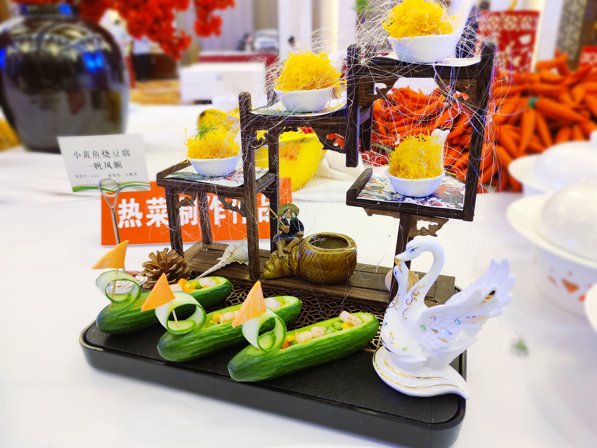 熱菜制作、冷菜制作、精細(xì)刀工的參賽選手紛紛拿出看家的本領(lǐng)、亮出練就的絕活,貌似很平常不過的每一道熱菜、每一盤冷菜、每一種面點(diǎn)、每一個(gè)刀法、每一項(xiàng)裝飾卻蘊(yùn)含著細(xì)致入微、精雕細(xì)琢、至真至誠,琳瑯滿目的精美食品燃起了一場(chǎng)味蕾風(fēng)暴,用色、香、味、形征服了賽場(chǎng)的所有人。
