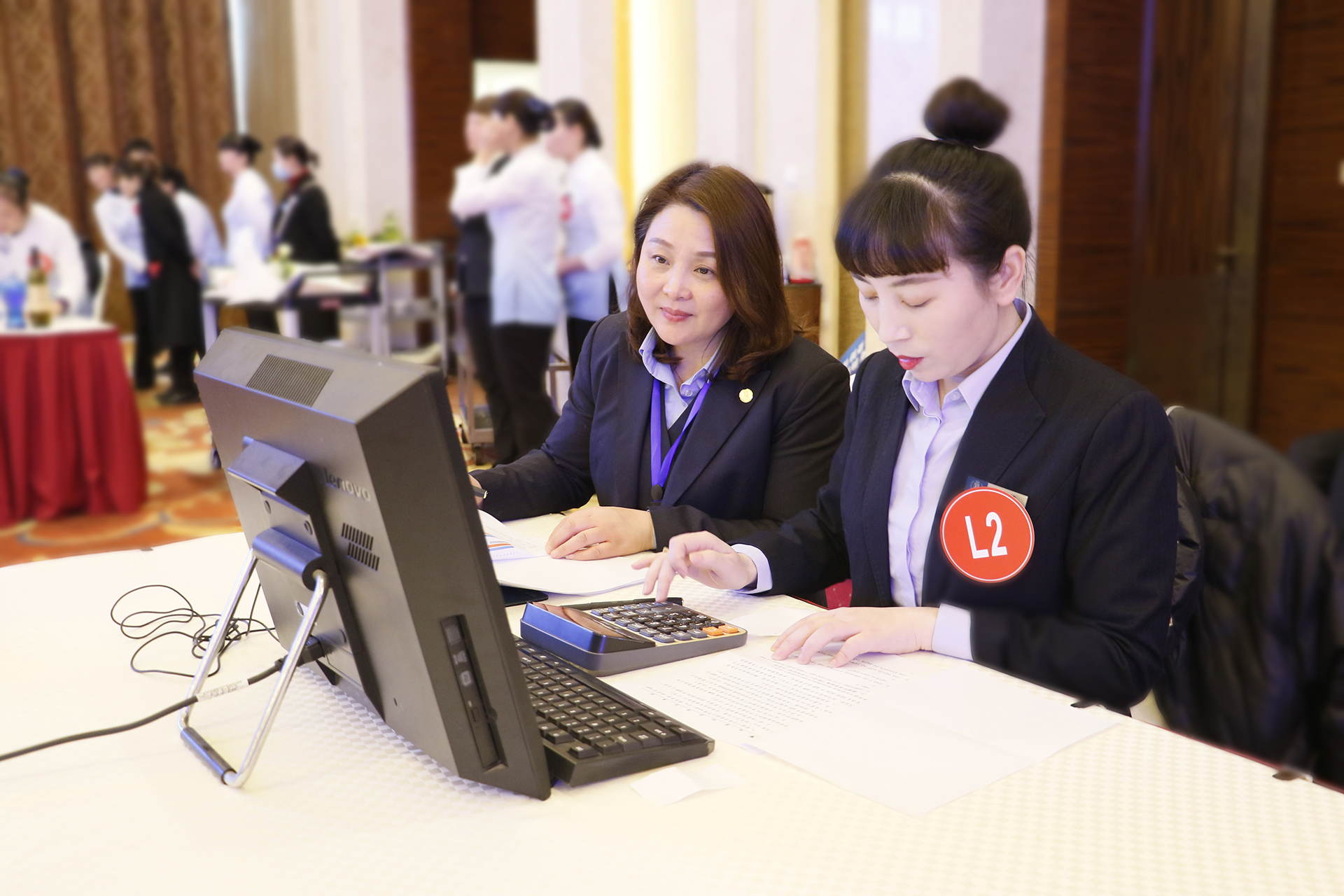 ▲ 餐廳服務(wù)評(píng)委夏春蘭、張利亞、季明霞在認(rèn)真評(píng)判